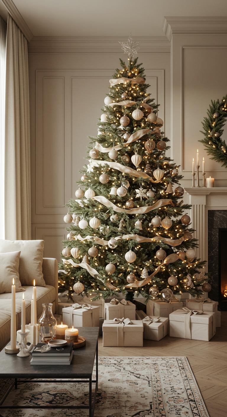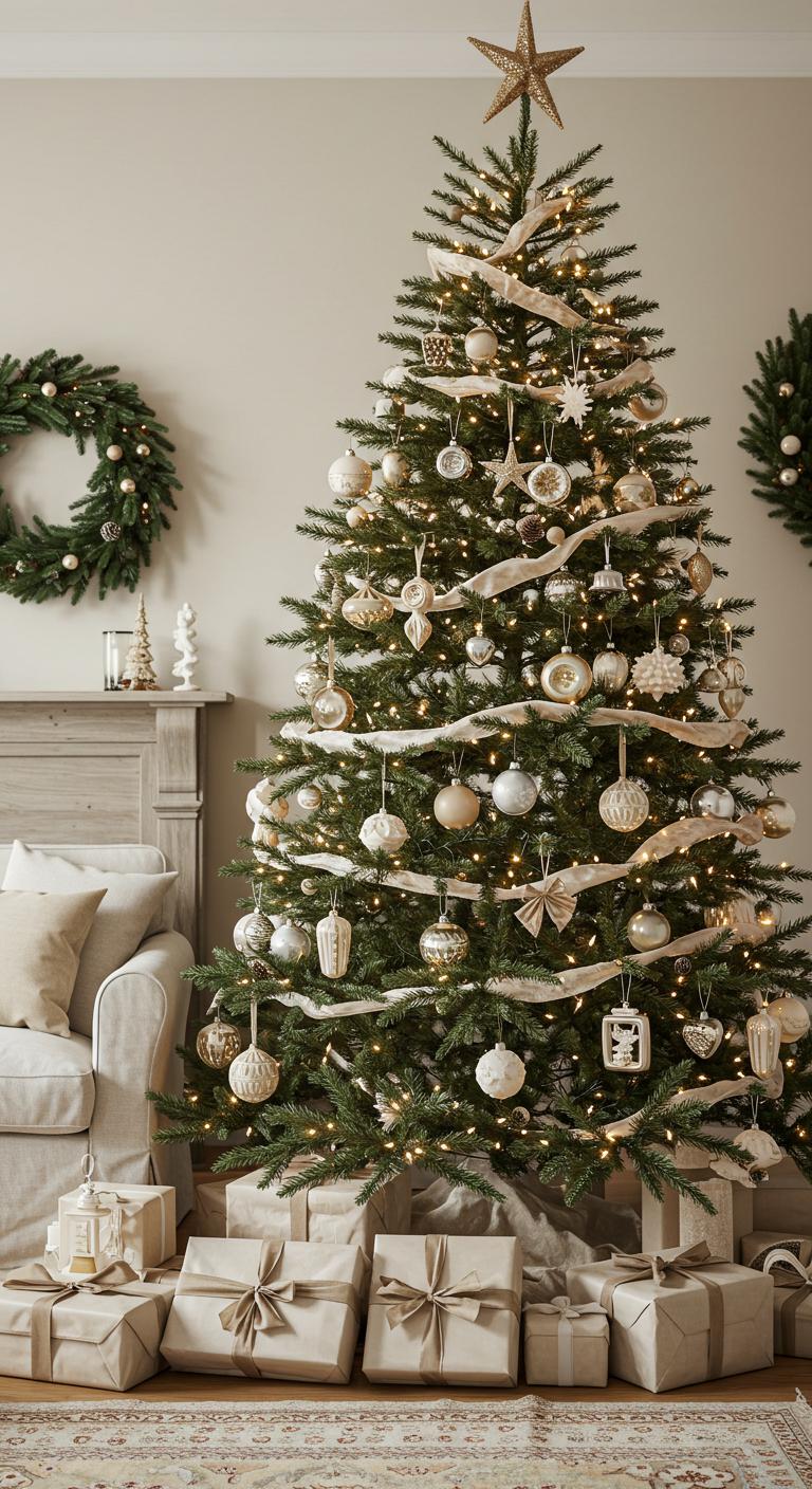 Adorn your tree with elegant beige ornaments that whisper sophistication, while cream garlands drape gracefully, adding texture and warmth.