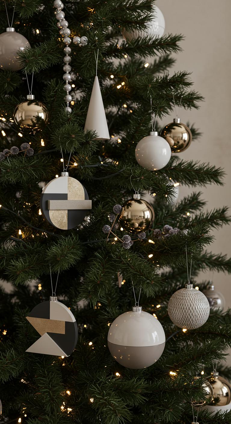 Embrace bold geometric shapes and clean lines, which add a trendy flair to your tree.