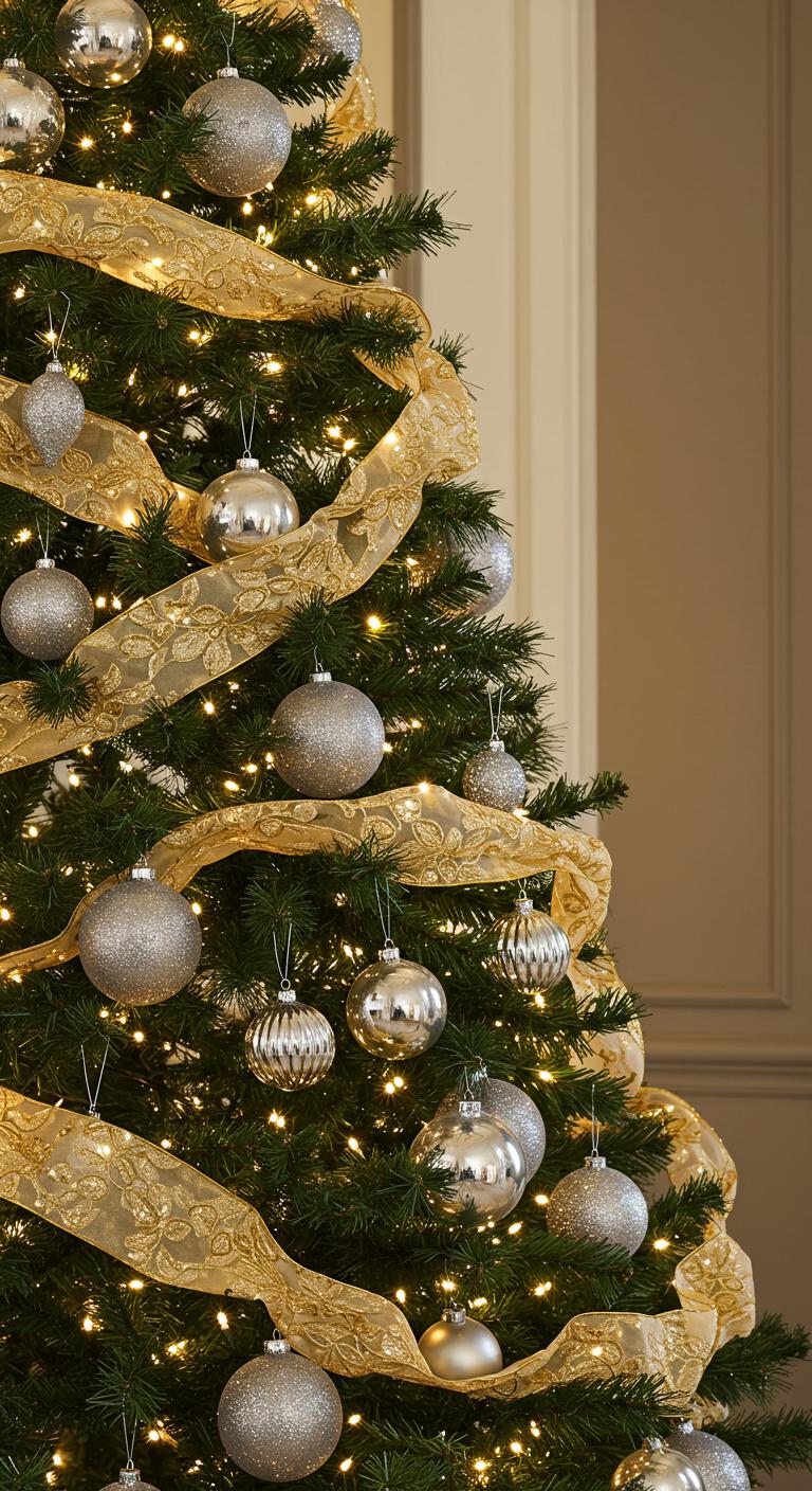 Picture shimmering silver ornaments glistening against lush green branches, complemented by cascading gold ribbons that dance with the light.