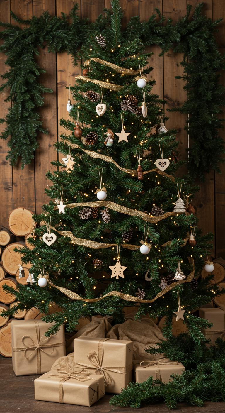 Embracing natural wood and pine elements can transform your Christmas tree into a rustic yet chic centerpiece.