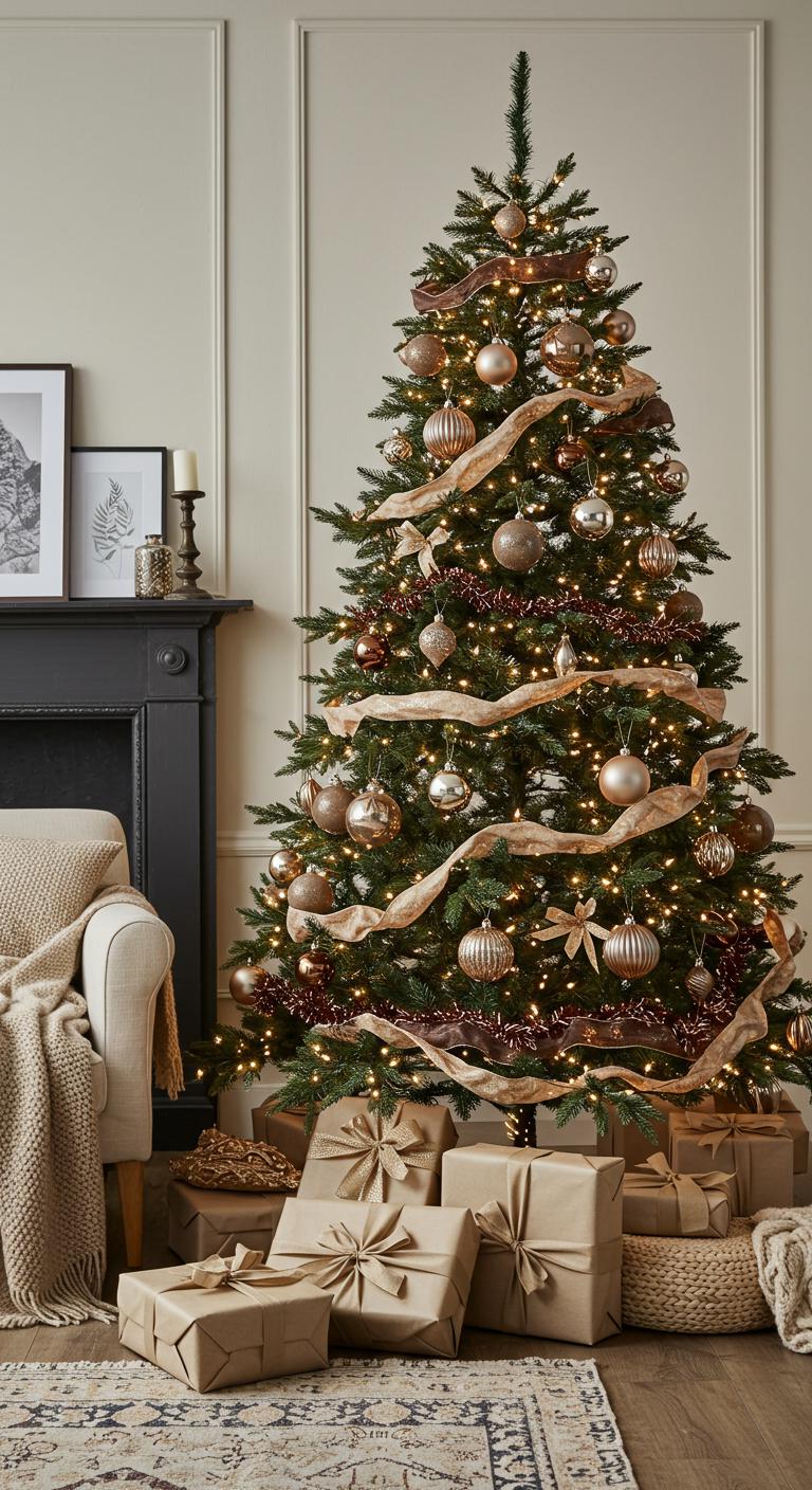 After adding those cozy fleece and knit accents, consider embracing a warm taupe and brown palette to elevate your Christmas tree’s charm.