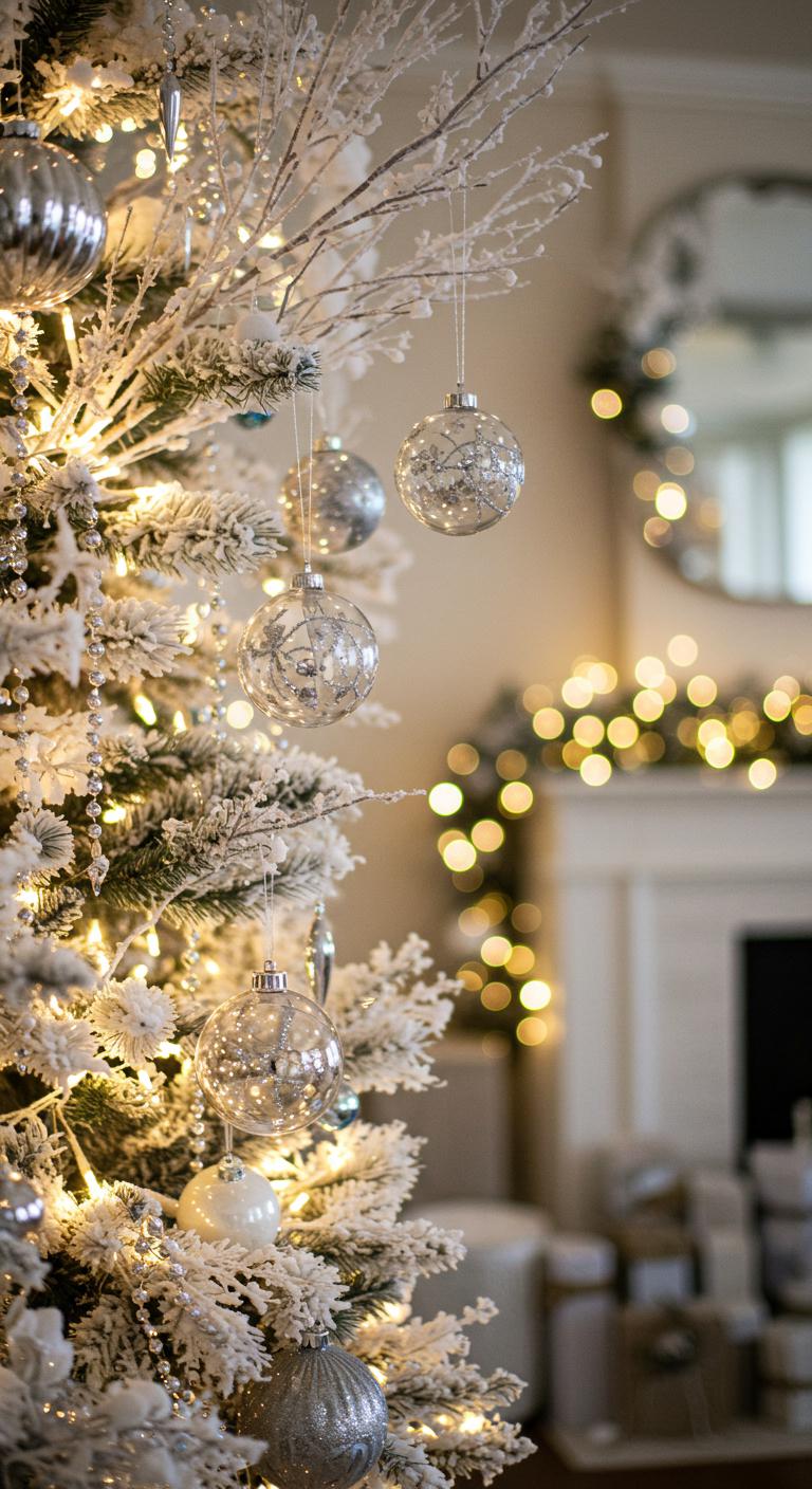 Picture frosted ornaments glistening like fresh snowflakes, hanging delicately among snowy branches that evoke the magic of winter.