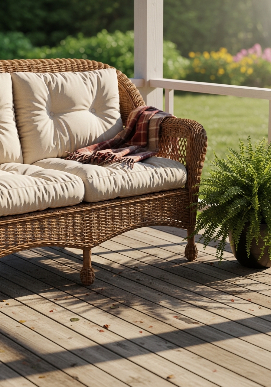 A wicker loveseat reads cozy without taking over a small porch. I chose resin wicker in a dark brown that resists fading. The loveseat I found measures 48 inches wide — perfect for two. I paired it with a brown wicker loveseat and foam-filled outdoor seat cushions. Styling tip: add a 20×20 patterned pillow and a textured throw. Mistake to avoid: skipping cushion ties; lightweight pads will slide off on windier days.