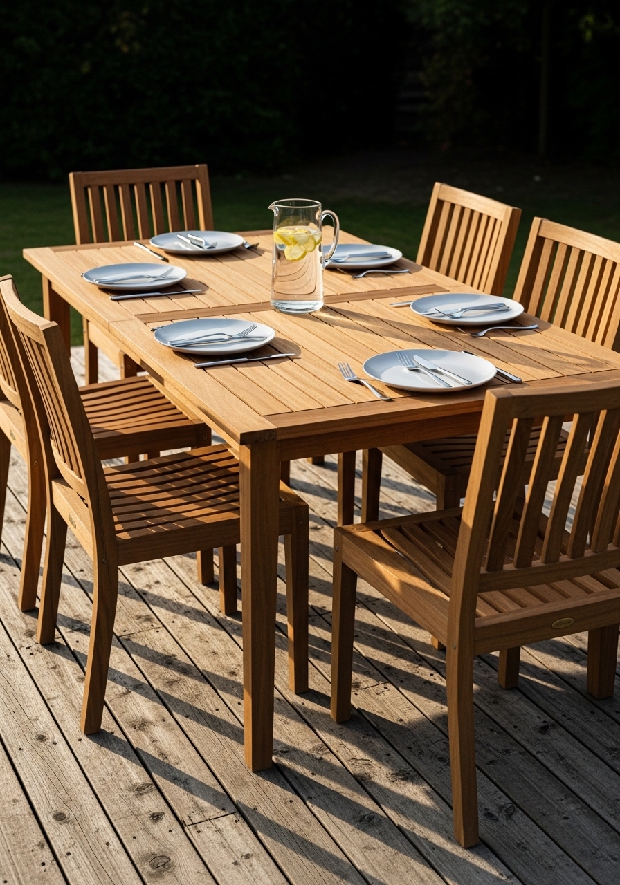 Teak ages gracefully and stands up to weather. I recommend 30-inch width tables and lengths from 60–96 inches for 4–8 people. My teak table is 72 inches and stays outside year-round. I used this teak dining table and outdoor dining chairs in wicker. Styling tip: use a runner and low centerpiece for easy conversation. Mistake to avoid: buying stained woods that need constant oiling unless you want high upkeep.