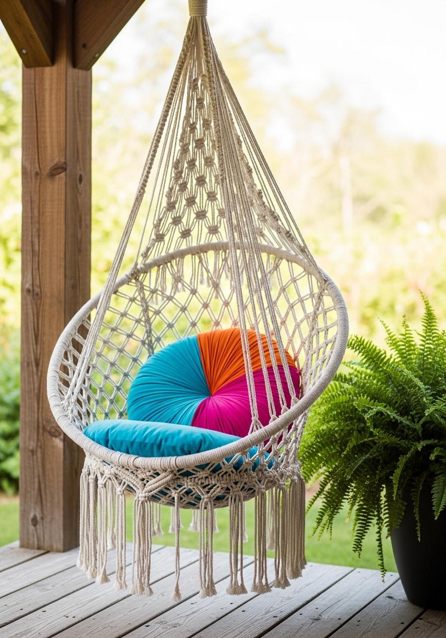 I added a macramé hammock chair and found it becomes an instant retreat. I picked a 300–350 lb-rated chair and a 40–45 inch seat. I paired this macramé hammock chair with an outdoor floor cushion 24×24. Styling tip: hang at 28–32 inches from the ground to get that slight swing. Mistake to avoid: using a non-weatherproof cushion outside full-time.