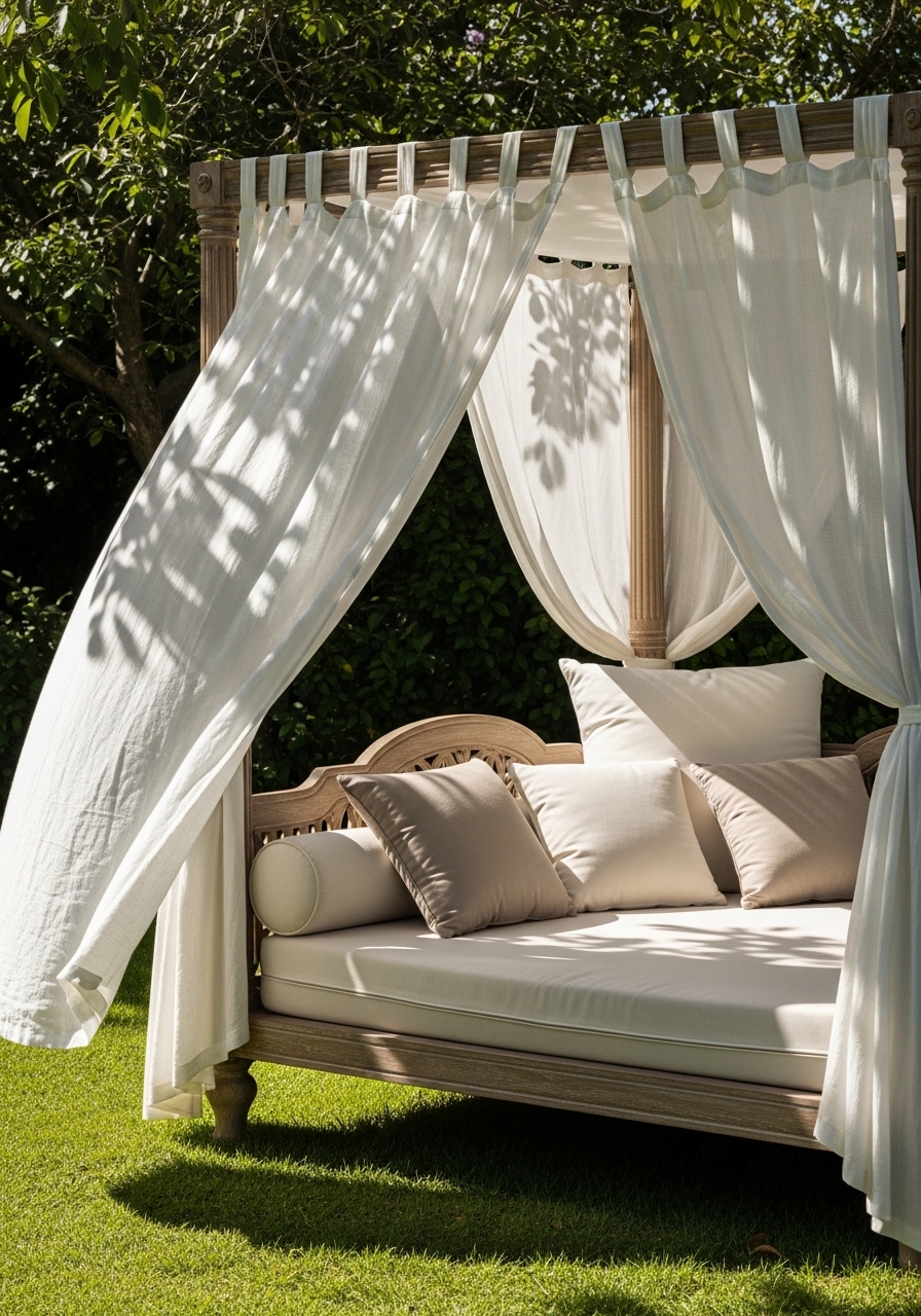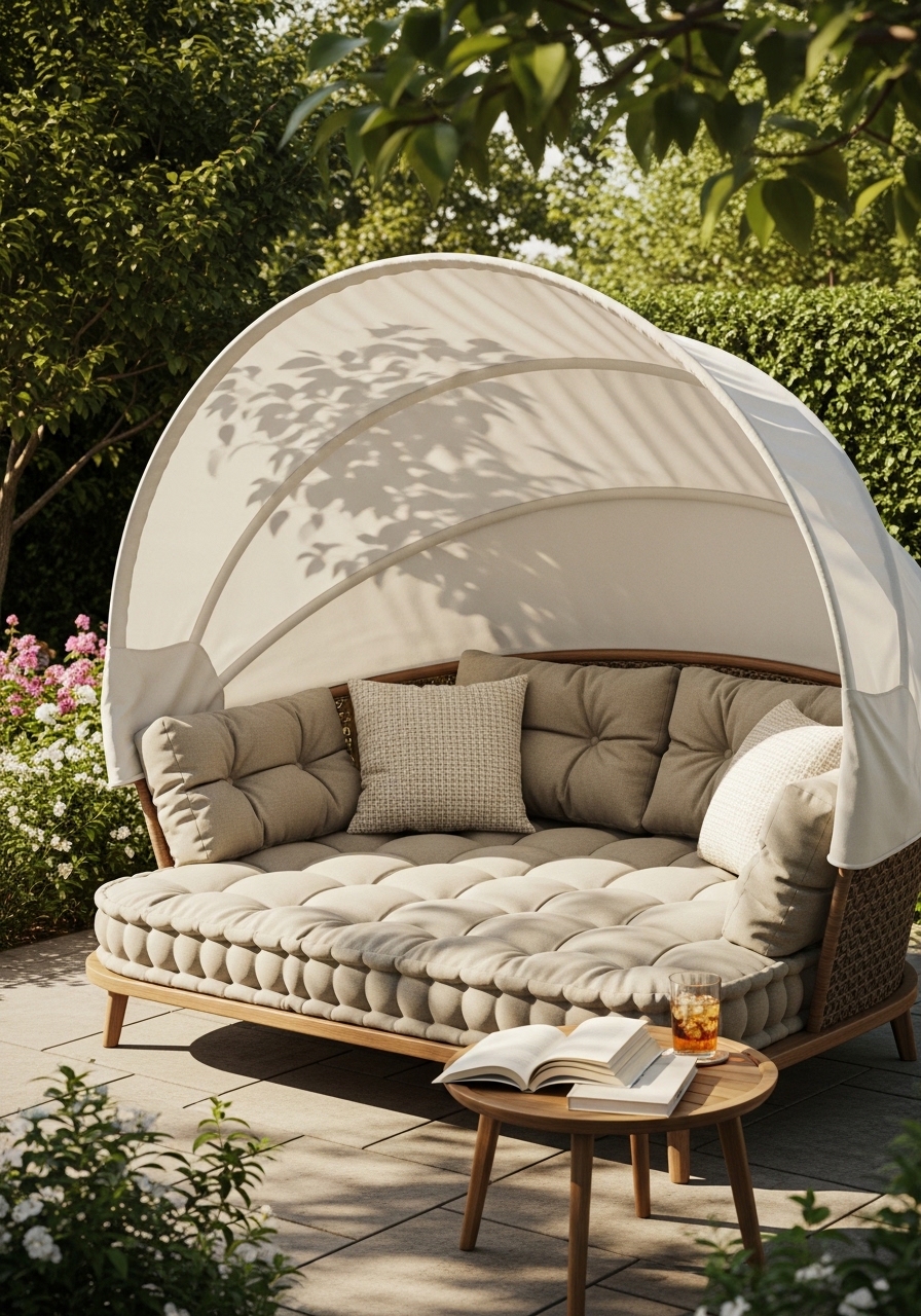A canopy daybed reads like a mini resort. I like a 78–86 inch frame and curtains that zip closed. I selected a canopy daybed with curtains and outdoor curtain panels 50×96. Styling tip: anchor with a low tray table for drinks. Mistake to avoid: leaving curtains unsecured in wind — use tiebacks.