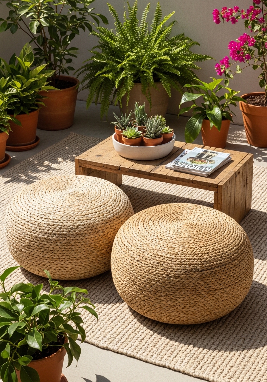 Poufs are my quick fix for extra guests. A 16–20 inch pouf covers most needs. I keep three on my patio for flexible seating and footrests. I use these woven poufs and a 20-inch outdoor floor cushion. Styling tip: arrange in odd numbers (3 or 5) for visual balance. Mistake to avoid: picking tiny poufs that read as decor only, not seating.