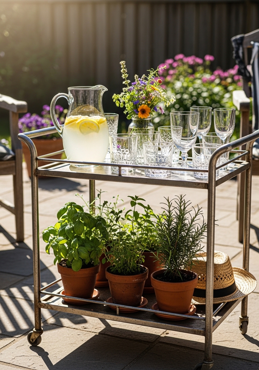 A bar cart keeps everything within reach when guests arrive. I chose a two-tier steel cart with lockable wheels. It holds bottles, glasses, and a small ice tub. I bought this outdoor bar cart and shatterproof outdoor glassware set. Styling tip: include a bowl for citrus and a small vase. Mistake to avoid: over-styling with fragile items — use shatterproof accessories outdoors.