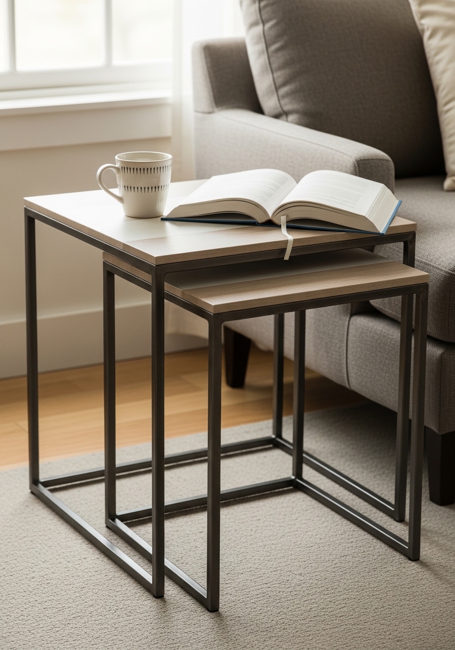 Nesting side tables are my favorite small-space solution. The largest should be about 18–20 inches high. I picked a set with a 15-inch and 20-inch table in black steel. I bought metal nesting side tables and a waterproof coaster set. Styling tip: stagger heights for visual interest. Mistake to avoid: placing only one small table for a sofa — people need surfaces for drinks.