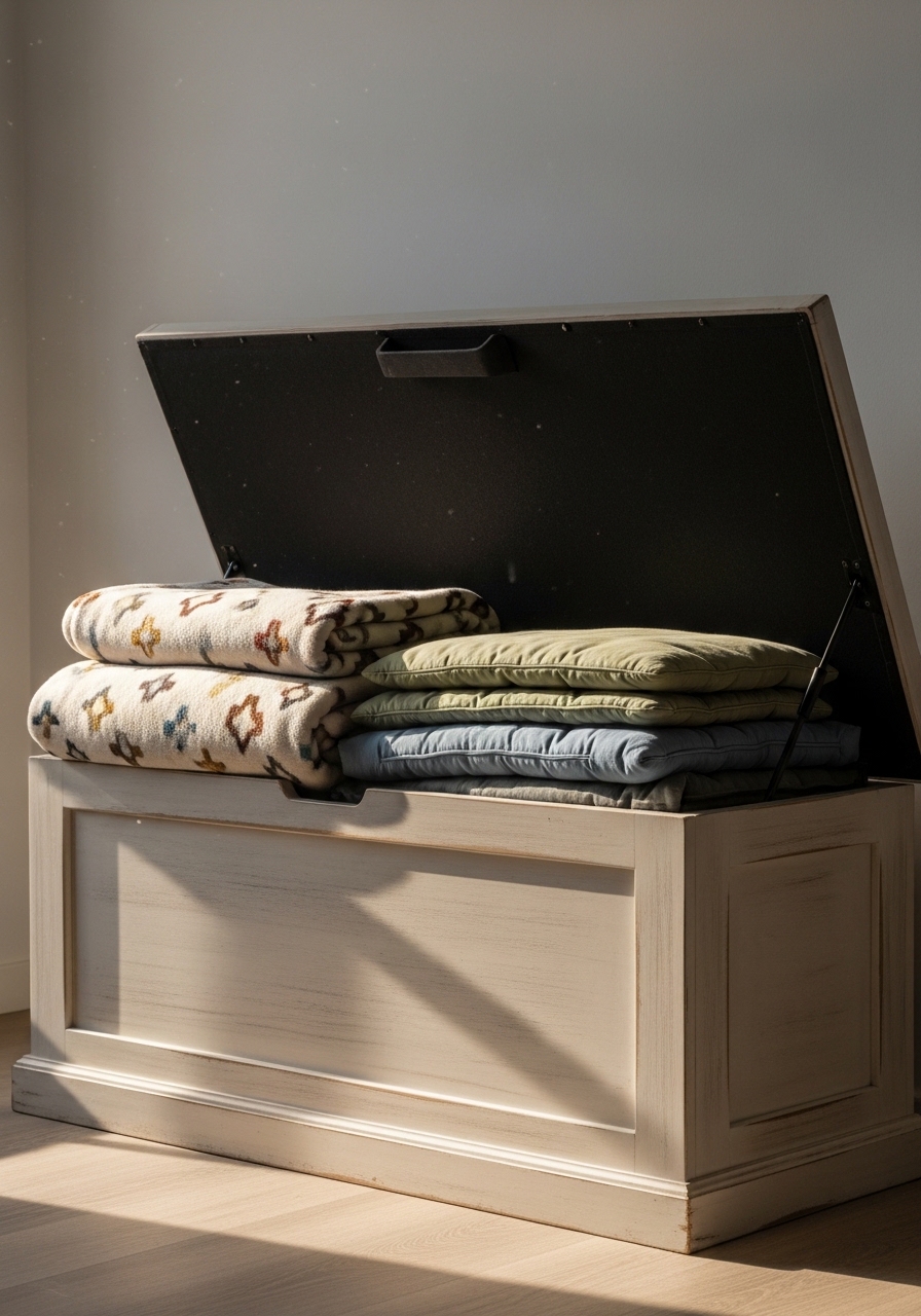 A storage bench hides pillows and doubles as seating. I use one that's 40–48 inches wide with a 20-inch cushion. I chose a waterproof outdoor storage bench and a 48-inch bench cushion. Styling tip: top it with two pillows for a sofa-like look. Mistake to avoid: buying a bench without drainage — stored cushions can mildew.
