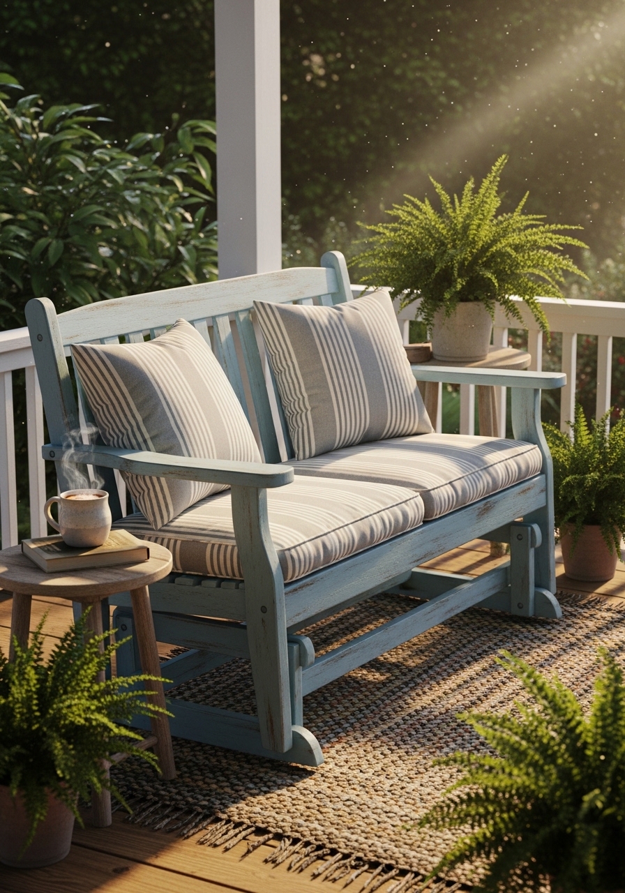 A glider bench offers a gentle motion that feels relaxing. I chose a 48–60 inch bench with weatherproof cushions. My glider is solid eucalyptus. I bought a porch glider bench and outdoor glider cushions. Styling tip: limit pillows to two to keep the seat comfortable. Mistake to avoid: placing on uneven floor — gliders need stable support.