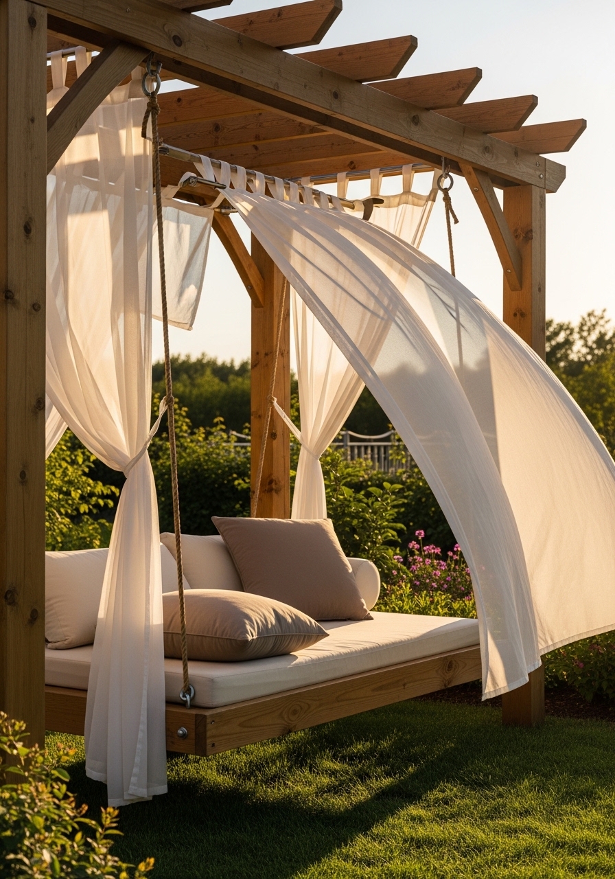 A pergola swing bed creates a dramatic focal point. I recommend a 60–72 inch mattress surface and sturdy hanging hardware. I anchored mine to reinforced pergola beams. I used this outdoor swing bed and an outdoor mattress pad 60×30. Styling tip: keep bedding breathable and neutral. Mistake to avoid: hanging from standard rafters without reinforcement.