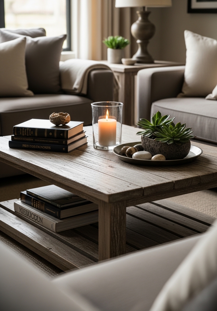 A low coffee table anchors seating and invites lingering. I like 36–48 inches long and a 16–18 inch height for low sofas. My table is eucalyptus in a gray wash. I use a weathered outdoor coffee table and an outdoor tray 20×12. Styling tip: keep one tray for condensing items. Mistake to avoid: a too-high table that breaks the eye line with seating.