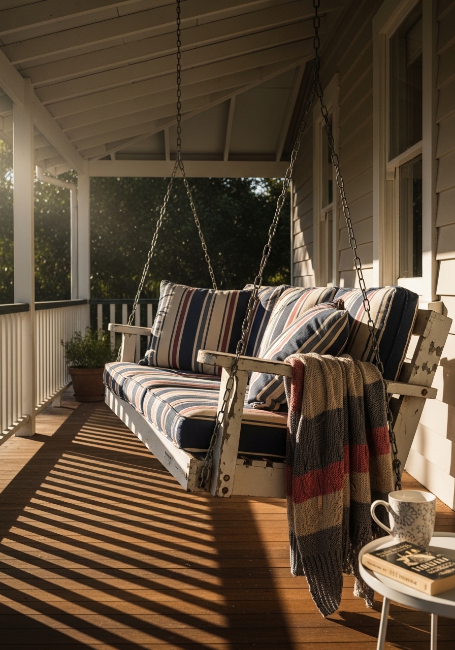 A porch swing invites conversation and slow mornings. I prefer a 48–60 inch swing with slatted back and thick cushions. My swing holds two adults comfortably. I used a wooden porch swing and 18-inch outdoor seat cushions. Styling tip: match cushion fabric to outdoor rug tones. Mistake to avoid: hanging too low — leave 12–16 inches from seat to floor.