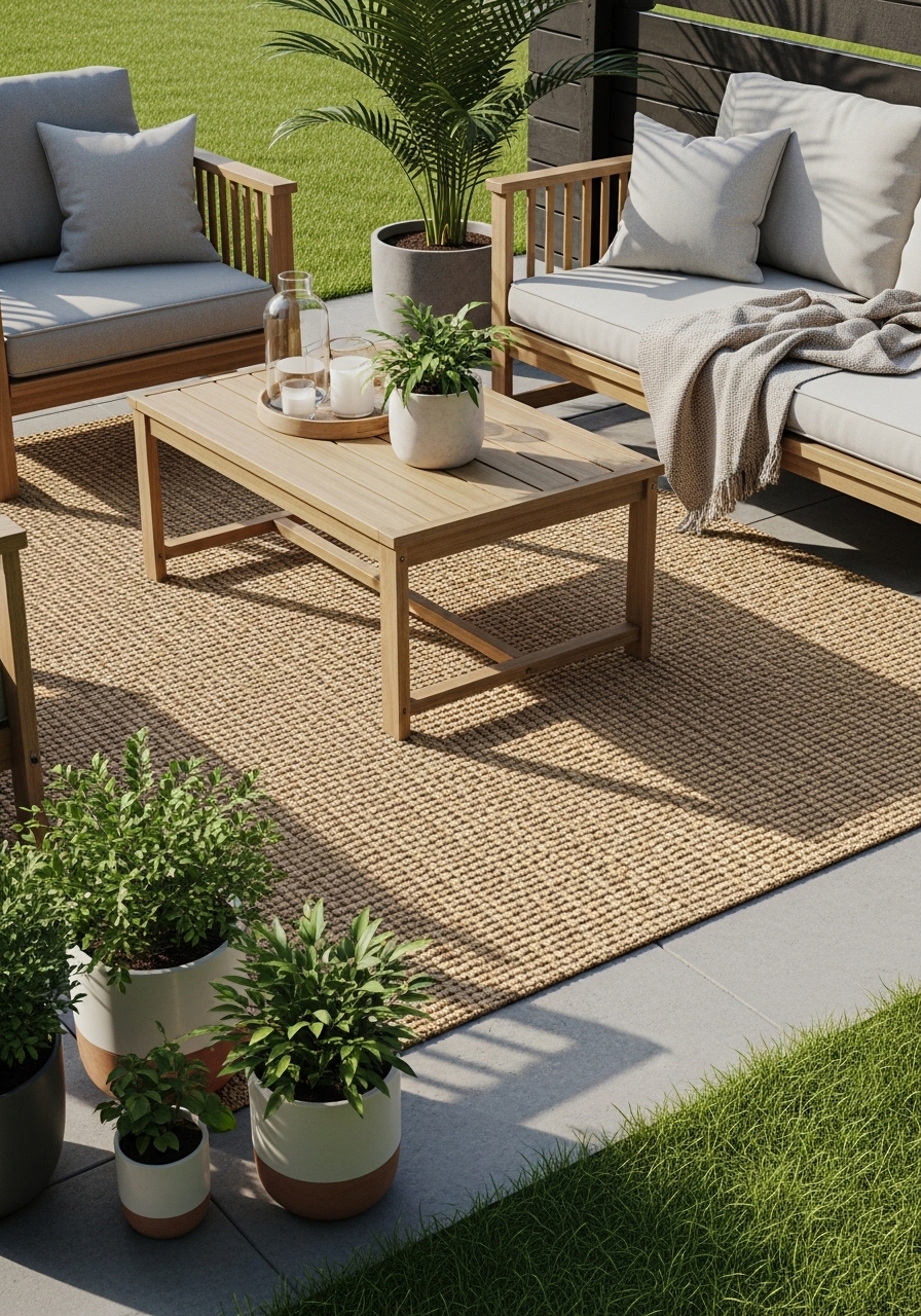 A rug pulls furniture into a defined area. For patio sets, I use at least an 8×10 for a sofa group or a 5×8 for bistro sets. I prefer polypropylene for easy cleaning. I bought an 8×10 outdoor rug and an anti-slip rug pad 8×10. Styling tip: choose a rug that’s slightly darker than cushions to hide dirt. Mistake to avoid: buying a rug too small — it will make the layout feel disjointed.