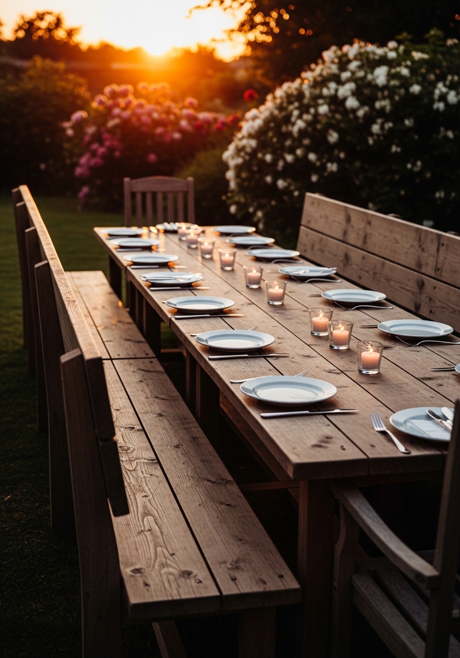 A bench adds flexible seating and a casual vibe. I suggest a 16–18 inch seat height to match standard dining tables and lengths of 48–72 inches. I bought an outdoor dining bench with backrest and waterproof seat cushions 48-inch. Styling tip: alternate cushions and pillows for comfort. Mistake to avoid: buying a bench without a backrest if you want longer meals — people lean back.