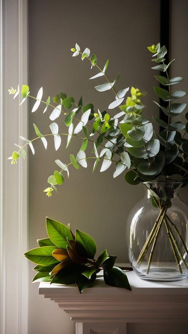 Bring in eucalyptus or faux stems to liven things up. Place them on a shelf or table. This adds life after holidays. For low-cost ideas, clip branches from your yard. DIY step: Arrange them in a jar you already have. No need for fancy vases. Position a few stems where light hits. They brighten dark areas. Keep it to three pieces max. Your room gains a natural feel. Try this on a windowsill first. It takes minutes. Watch how it changes the vibe.