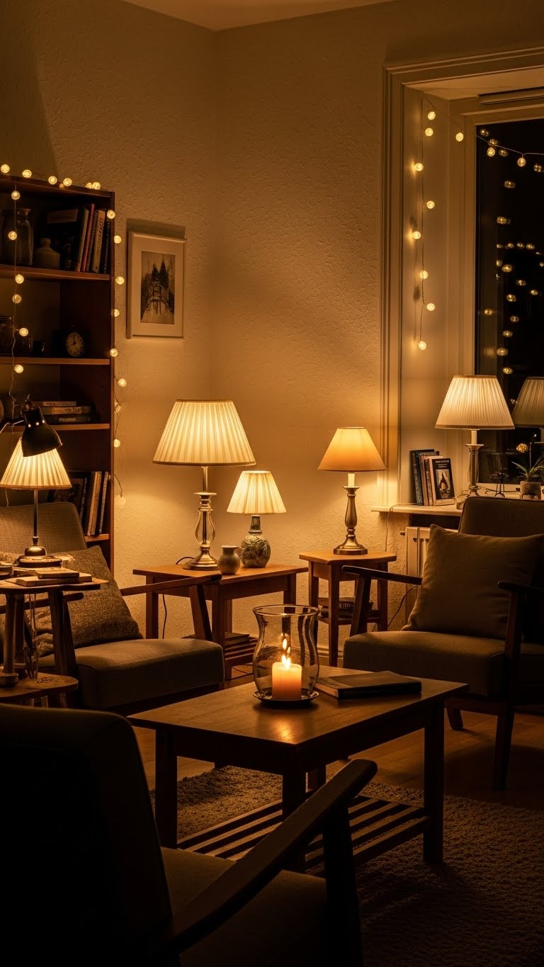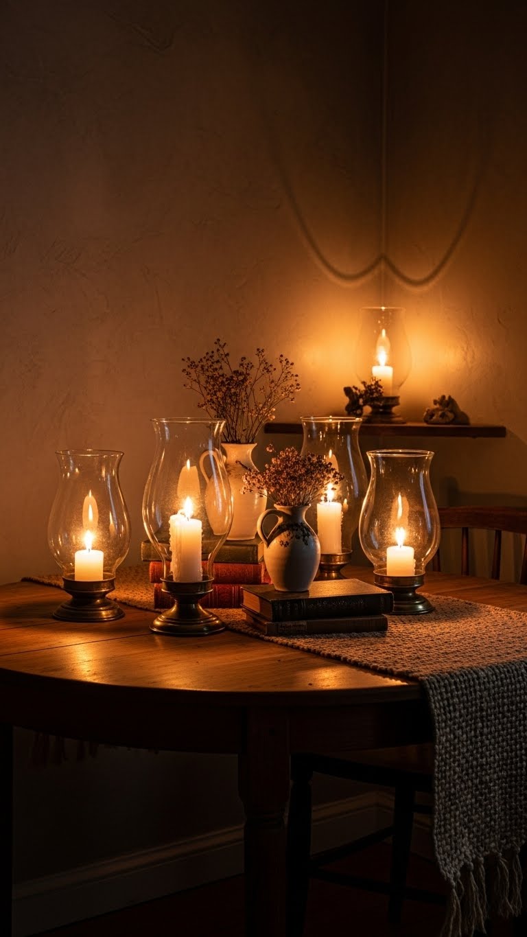 Set up candles in holders for a soft shine. Put them on mantels or tables. This makes evenings feel special. For budget finds, check dollar stores for basics. DIY tip: Group tea lights in a bowl from your kitchen. Light them at dusk. Layer with lamps for balance. Avoid harsh bulbs. Your space gets that inviting glow. Start with one spot. Build from there. It’s an easy win.