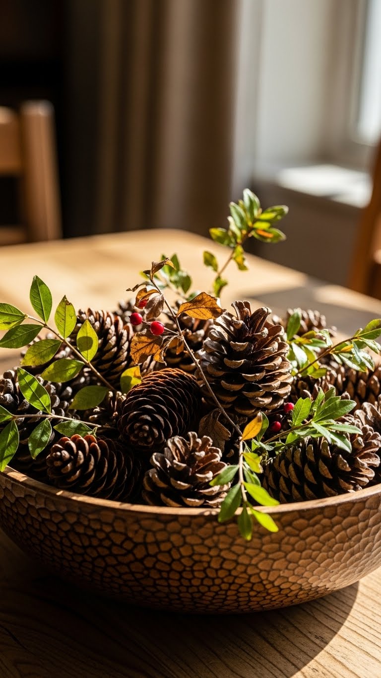 Gather pine cones for free decor. Put in bowls. This adds nature. For ideas, collect outside. DIY step: Arrange in a dish. Place on surfaces. Keep it fresh. Your space gets rustic. Do it outdoors.