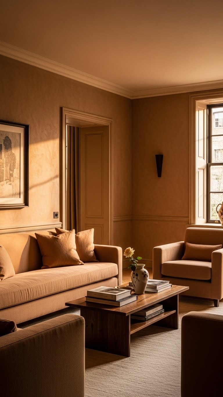 Go for caramel shades on walls. Apply to one area. This warms things. For budget paint, use samples. DIY idea: Brush on a test spot. Blend with fabrics. Your room looks rich. Start small.