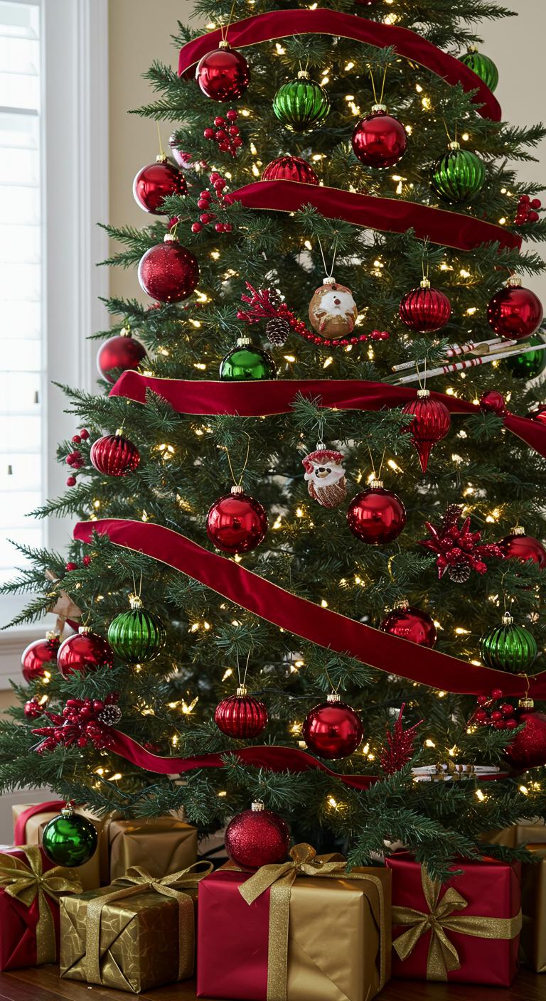 You’ll embrace classic red and green elegance with traditional ornaments and bold festive ribbons.