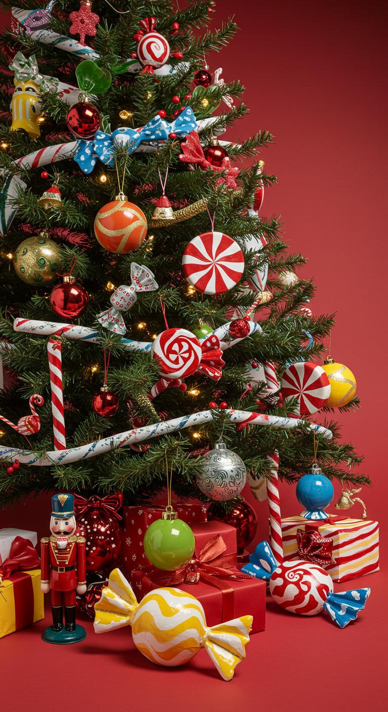 You’ll layer handmade ornaments, classic tin soldiers, and oversized candy baubles to evoke toyland nostalgia.