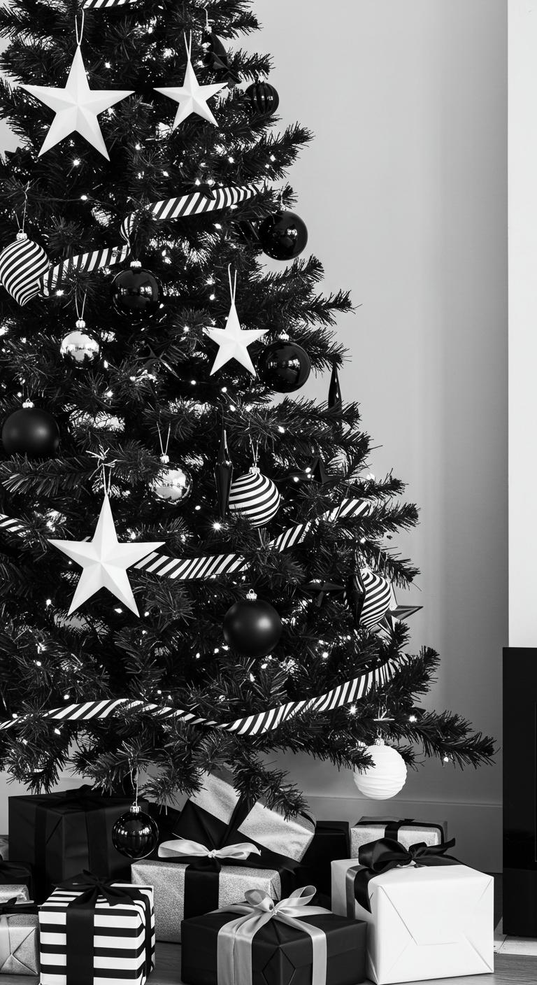 Monochrome black and white strips your tree to essentials, letting shape, texture, and contrast do the decorating—think matte black baubles beside glossy white stars, sculptural branches highlighted by stark ribbon lines, and patterned elements (stripes, polka dots, houndstooth) for visual energy.