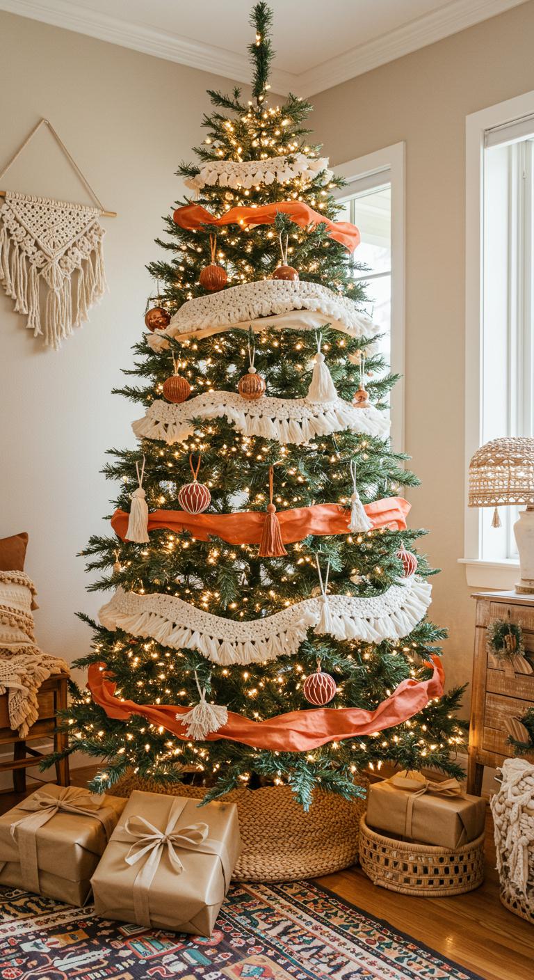 Although boho leans relaxed, you can make your tree feel intentional by layering natural textures, neutral tones, and handcrafted macramé ornaments that draw the eye without overwhelming the silhouette.