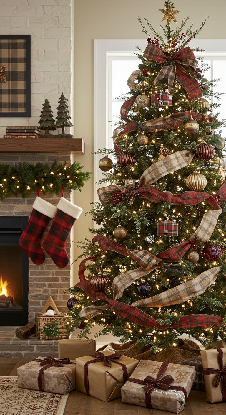 You’ll layer bold plaid patterns with muted greenery, leather ribbons, and matte ornaments.