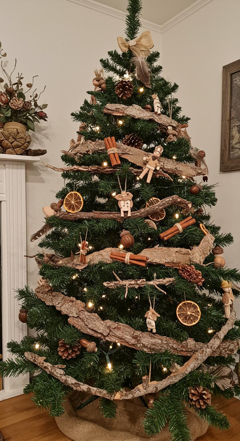 When you lean into rustic natural elements, think bark, branches, and burlap layered with soft evergreens to create an earthy, lived-in tree that still feels curated.