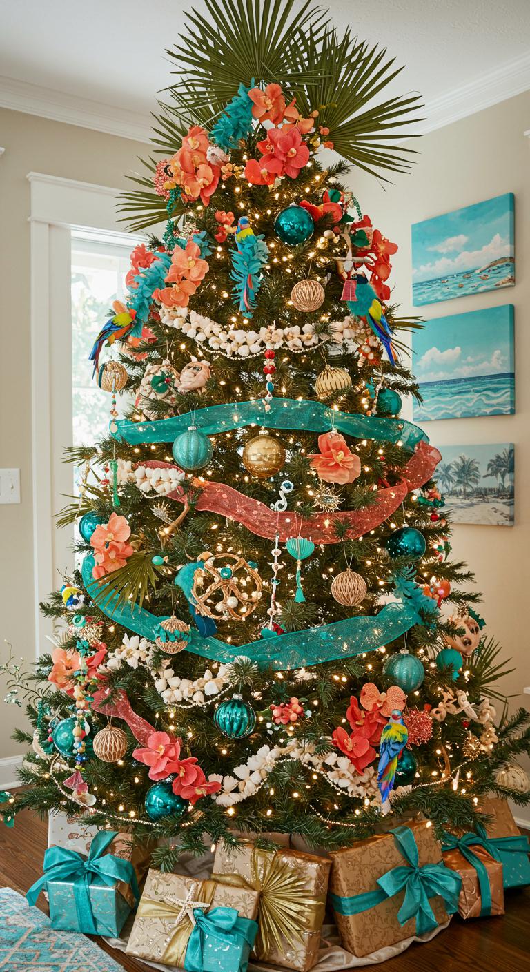 If you want your tree to feel like a sun-soaked getaway, swap pine cones for palm fronds, vibrant orchids, and shells strung like garlands.