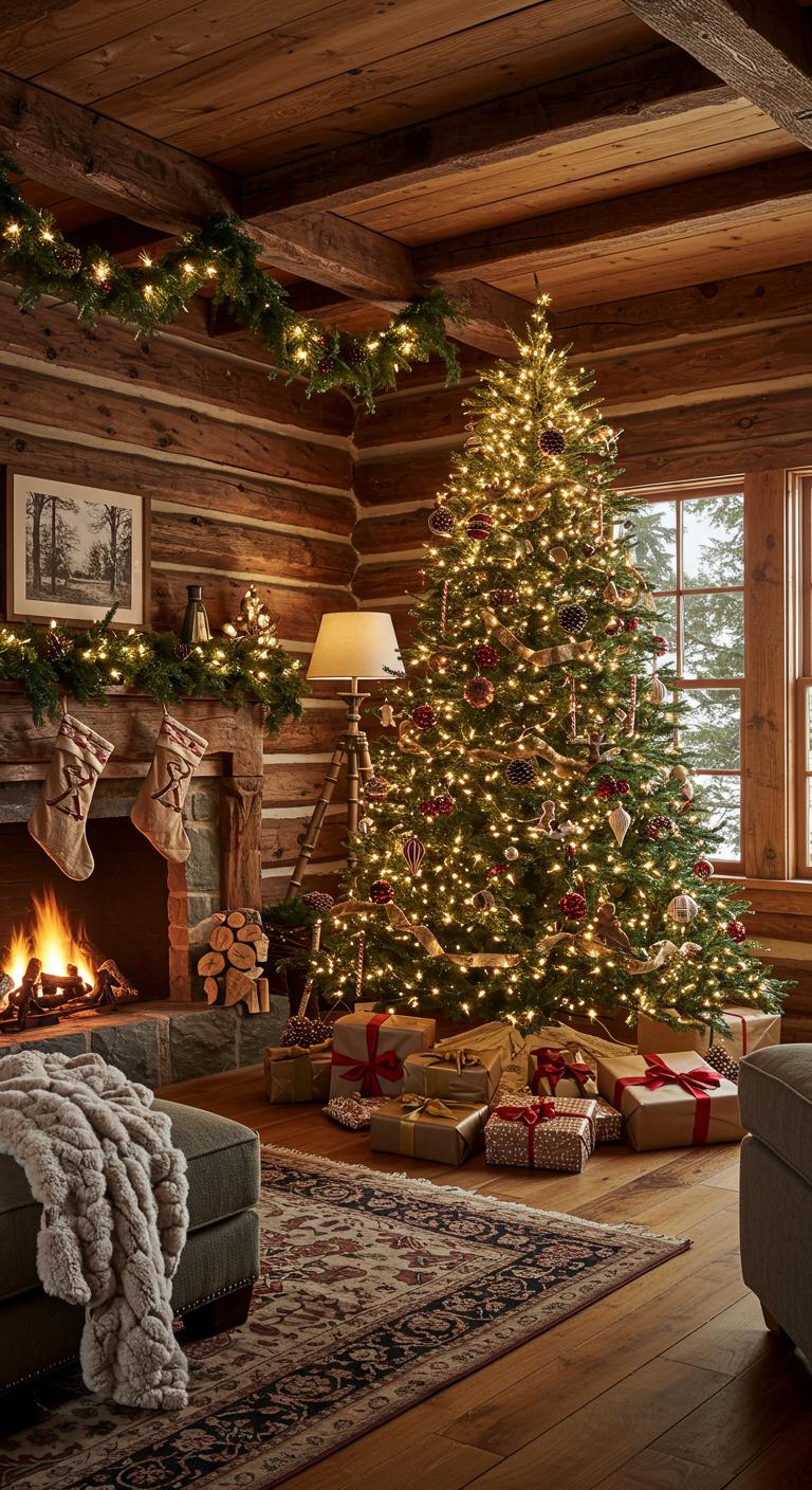 Think of cedar beams, wool throws, and a tree dressed like it grew right outside your door: mossy garlands, mini pinecones, and warm amber lights that make the room feel like a fireside story.