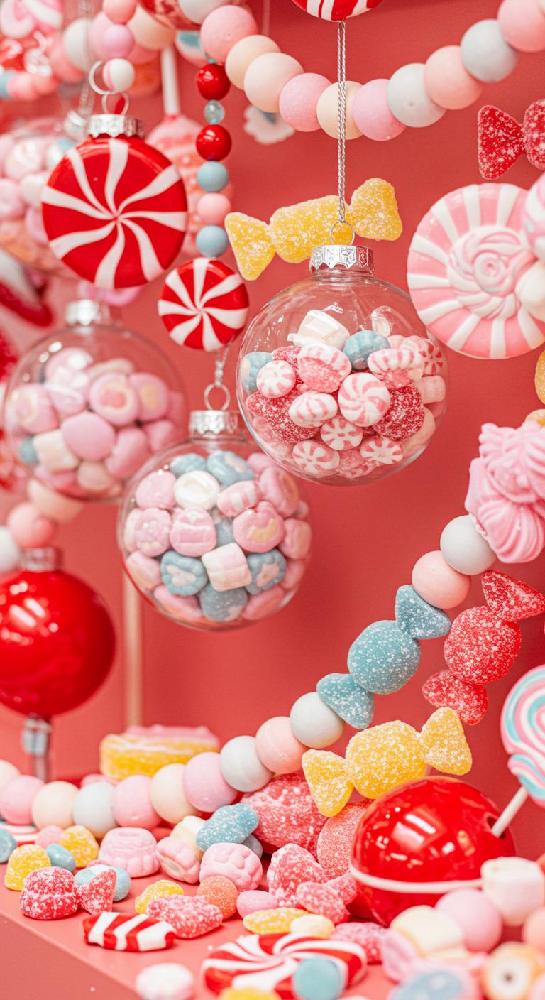 You’ll drape candy ornaments, garlands of faux gummies, and clear baubles filled with sweet treats.