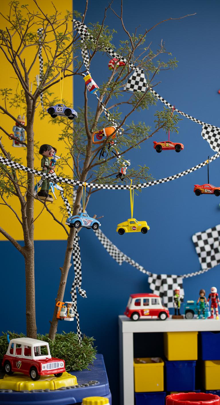 After the sugar-sweet spectacle, swap in a high-energy playroom look that celebrates little racers and mini-figures. You’ll clip toy car ornaments on branches, string checkered ribbon like starting lines, and tuck miniature action figures into boughs. Embrace a playful racing theme with bold primary colors and dynamic angles. It feels free, kinetic, and unmistakably kid-centric—easy to update as they grow.