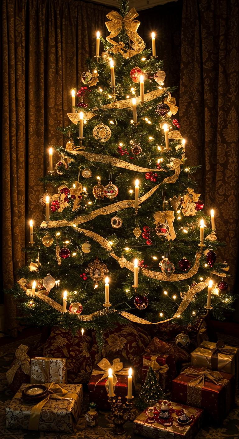 When you want a tree that feels like stepping into a period film, lean into Victorian splendor with heirloom baubles, layered lace ribbon, and warm candlelike lights that halo each branch.