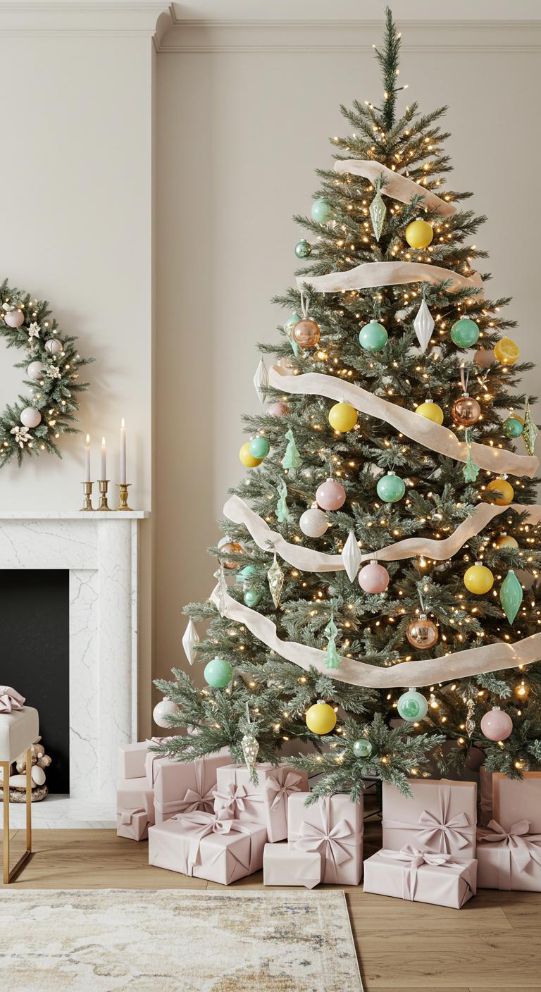 A pastel sherbet tree bathes your room in soft, modern charm—think whipped mint, blush peach, and lemon chiffon ornaments layered with translucent ribbons and matte glass baubles.