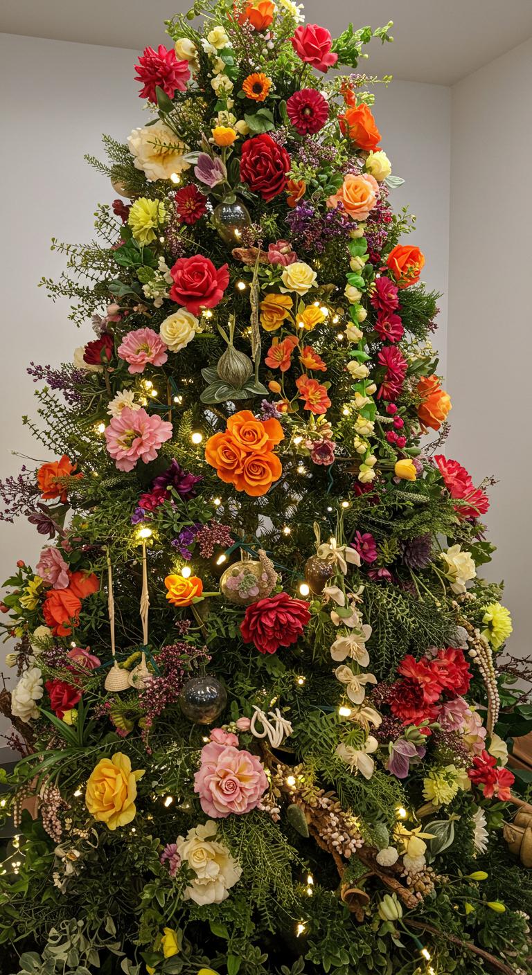 Shifting from reclaimed textures to blooming accents, the Garden-Inspired Floral Tree brings fresh petals and verdant sprays into your holiday scheme.