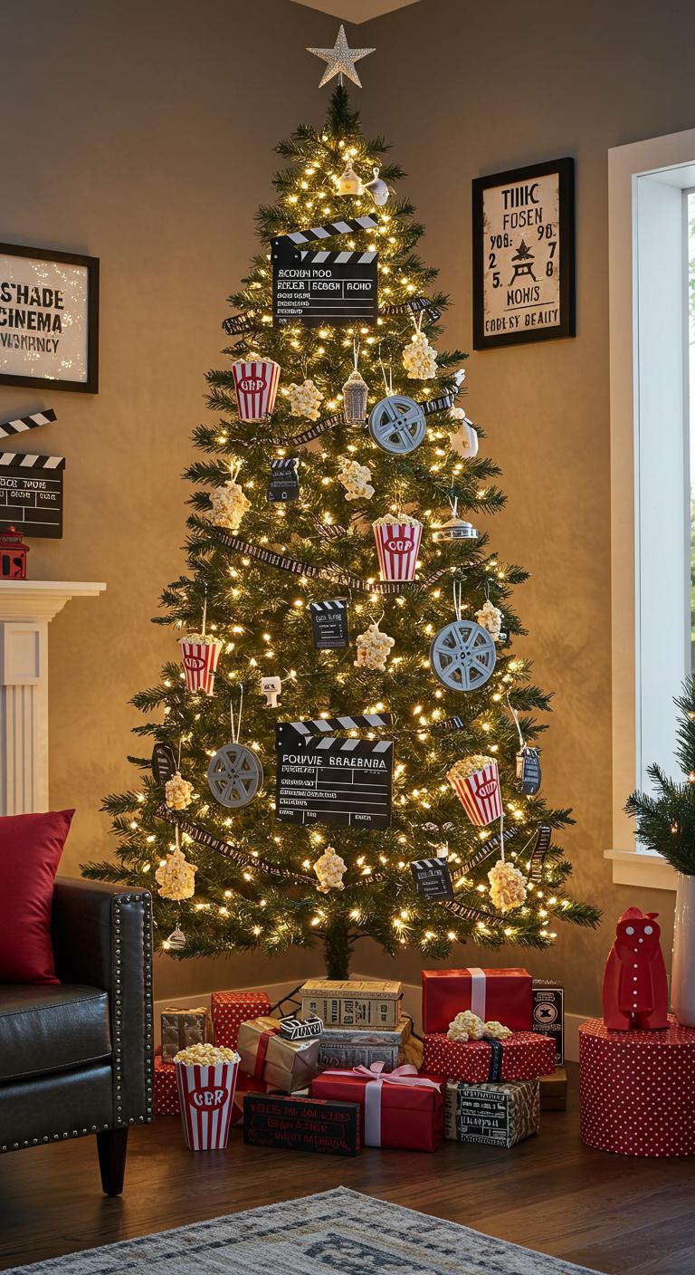 Turn your living room into a mini theater with a Movie Night Cinema tree that feels like a classic marquee—string warm fairy lights as your “spotlight,” drape tiny film reels and popcorn garlands, and top the tree with a faux clapperboard or star.