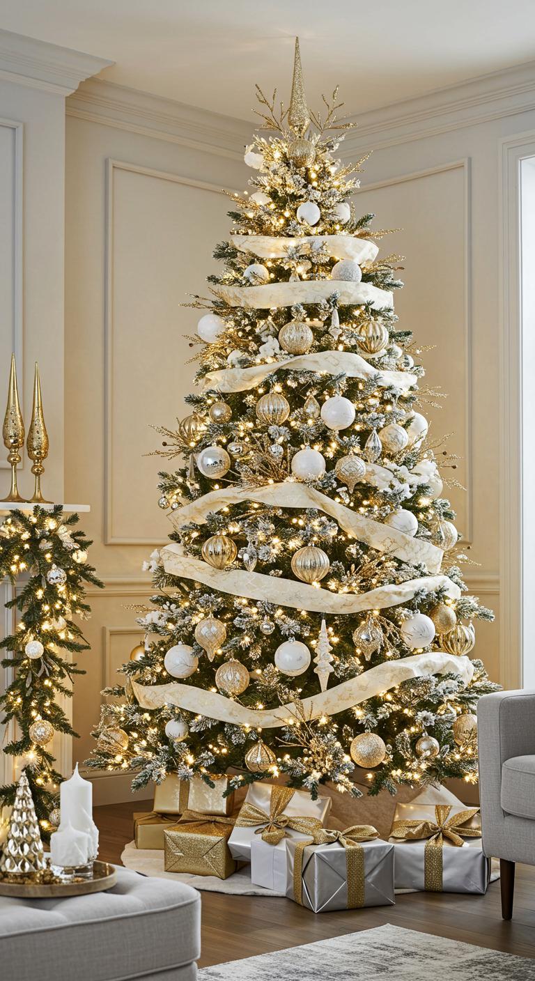 Turn your living room into a winter runway by dressing the tree in gleaming gold and crisp white—metallic ornaments, mirrored baubles, and satin ribbons catch the light while white flocking or glass icicles keep the palette fresh.