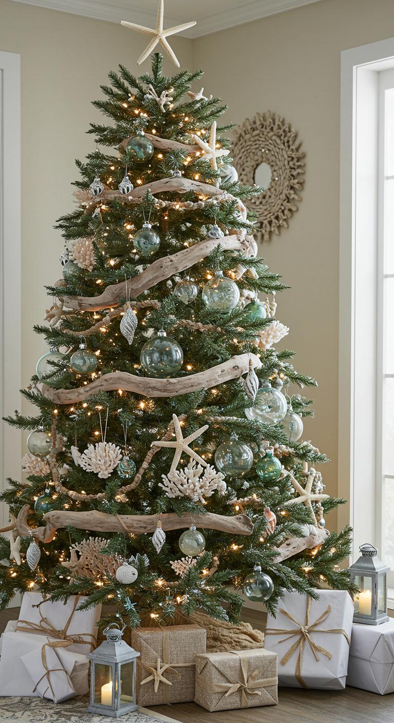 A seaside-inspired tree brings salt-sweet air and sunlit calm into your home, swapping pine-scented tradition for driftwood tones, weathered glass, and shells threaded like tiny ornaments.