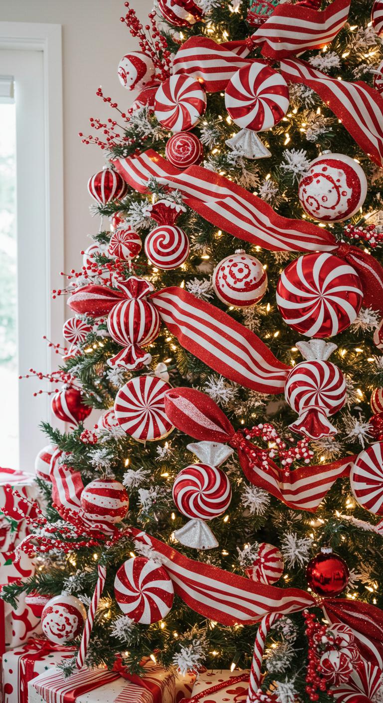 Step into Candy Cane Sweetness and let bold red-and-white stripes steer your decor: think glossy candy ornaments, peppermint swirl baubles, and oversized striped ribbons that give the tree a playful, graphic edge.
