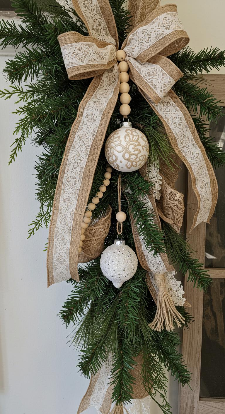 Farmhouse Burlap and Lace marries rustic warmth with delicate charm—think natural burlap ribbons, soft cream lace, wooden beads, and weathered metal accents layered on evergreen boughs.