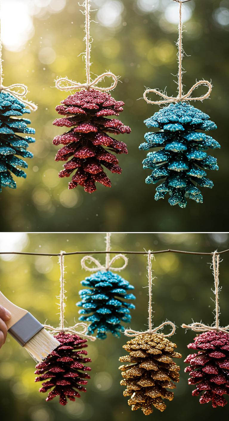 After you’ve pressed tiny palms into soft clay, shift to a more rustic, sparkly craft: glittered pinecone ornaments. You’ll clean cones, choose pinecone color variations, and brush adhesive into crevices. Try layered glitter application techniques—dabbing fine glitter then chunky—so light catches scales. Tie natural twine loops, add a touch of metallic paint, and hang them where breeze and sunlight set them gleaming.