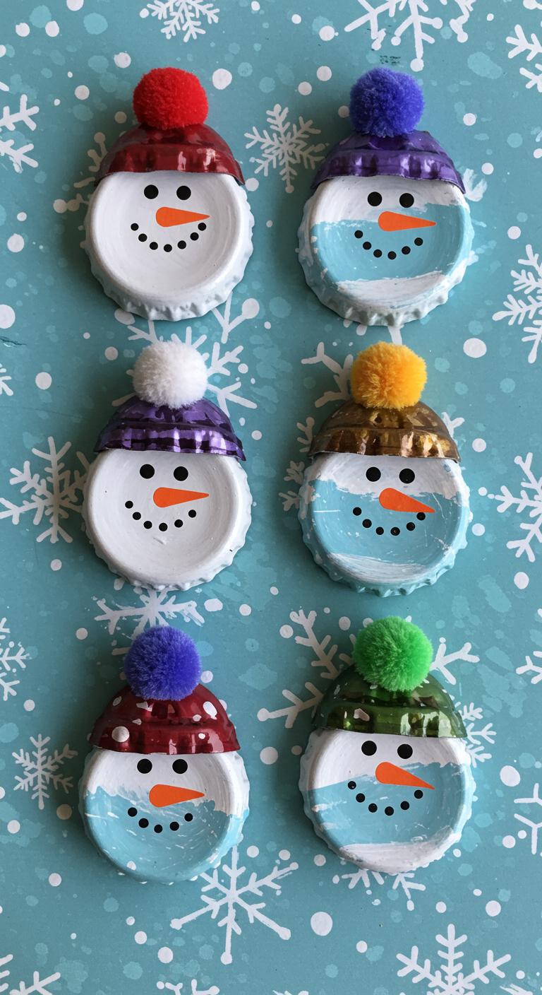 Add tiny coal-dot eyes, an orange carrot nose, and a magnet glued to the back. These bottle cap crafts make bold, portable snowman decorations for gifting or free-spirited keeping.