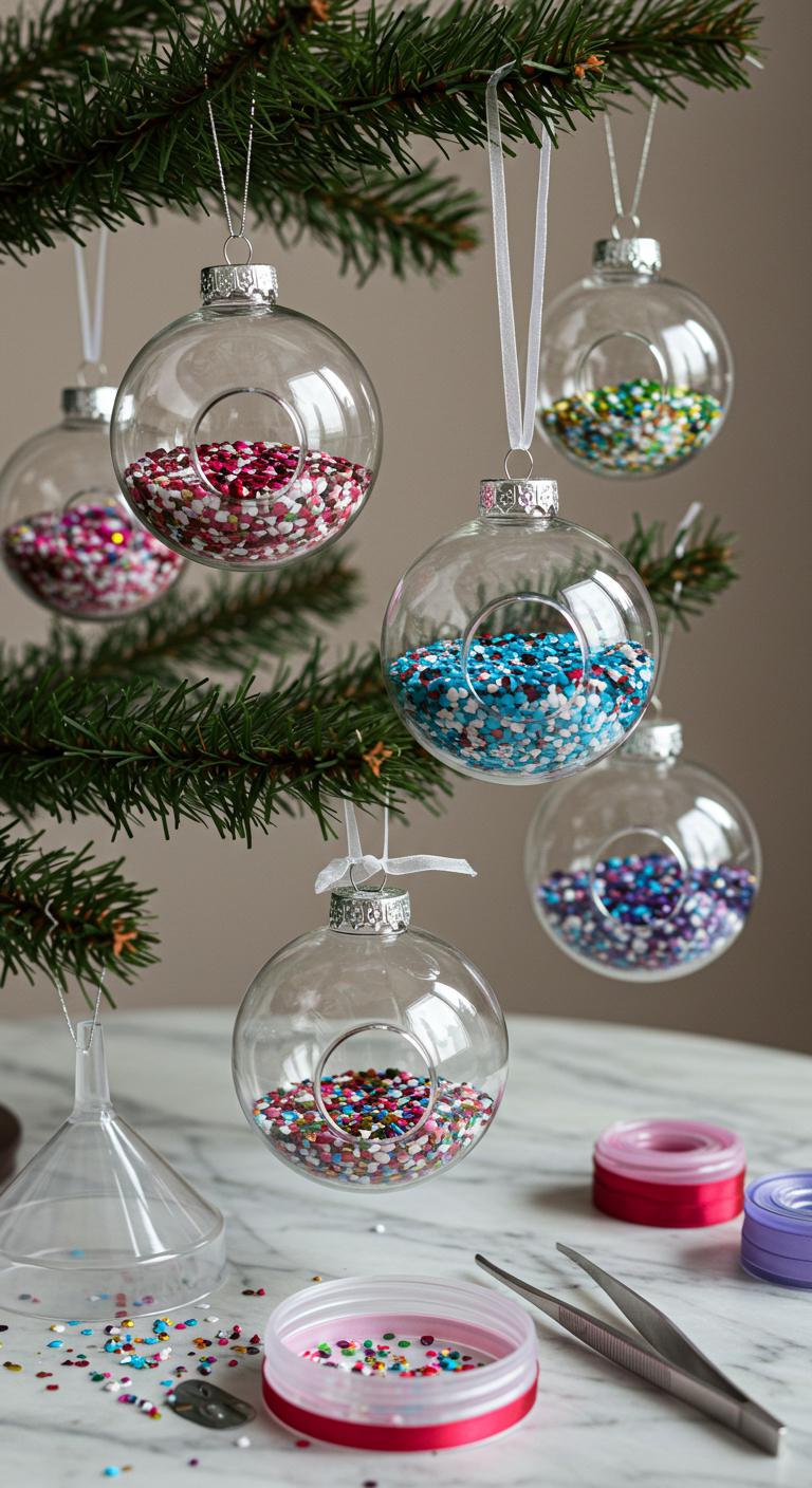 Clear glass baubles become little bursts of joy when you fill them with colorful confetti—you’ll get shimmering layers, playful textures, and a pop of personality on every branch.