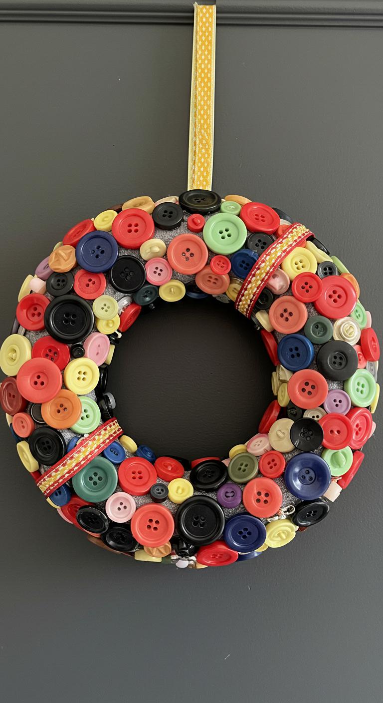 You’ll layer button color combinations on a foam ring, glue with precision, then weave ribbon texture choices through gaps for contrast.