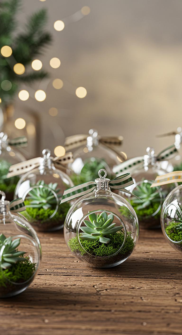 You’ll fill clear globes with tiny succulents or moss, pebbles, and a ribbon loop. Learn simple terrarium plant care, seal lightly, and hang for modern seasonal decoration ideas that celebrate creativity and freedom.