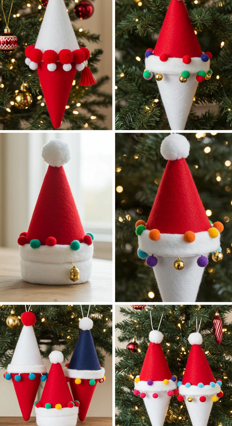 Small, cheerful pom-poms transform simple felt cones into instantly adorable Santa hat ornaments you’ll want to hang all over the tree. You’ll pick pom pom colors to match your mood — classic red and white or bold jewel tones — then stitch, glue, and trim with tassels, bells, and other festive embellishments. They’re quick, portable, and unapologetically joyful.