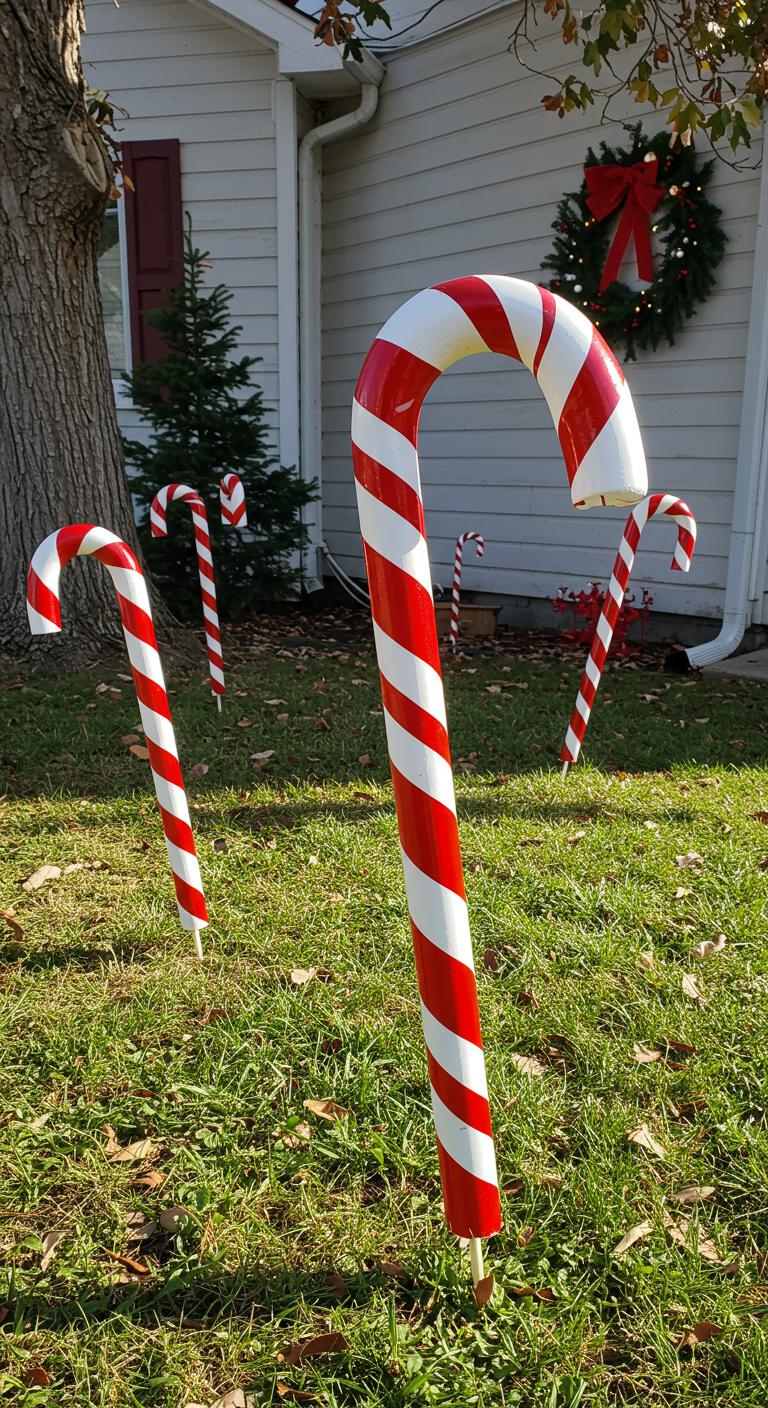 You’ll paint PVC or wooden stakes in bold candy cane colors, add solar-powered festive lighting, and stake them along paths.
