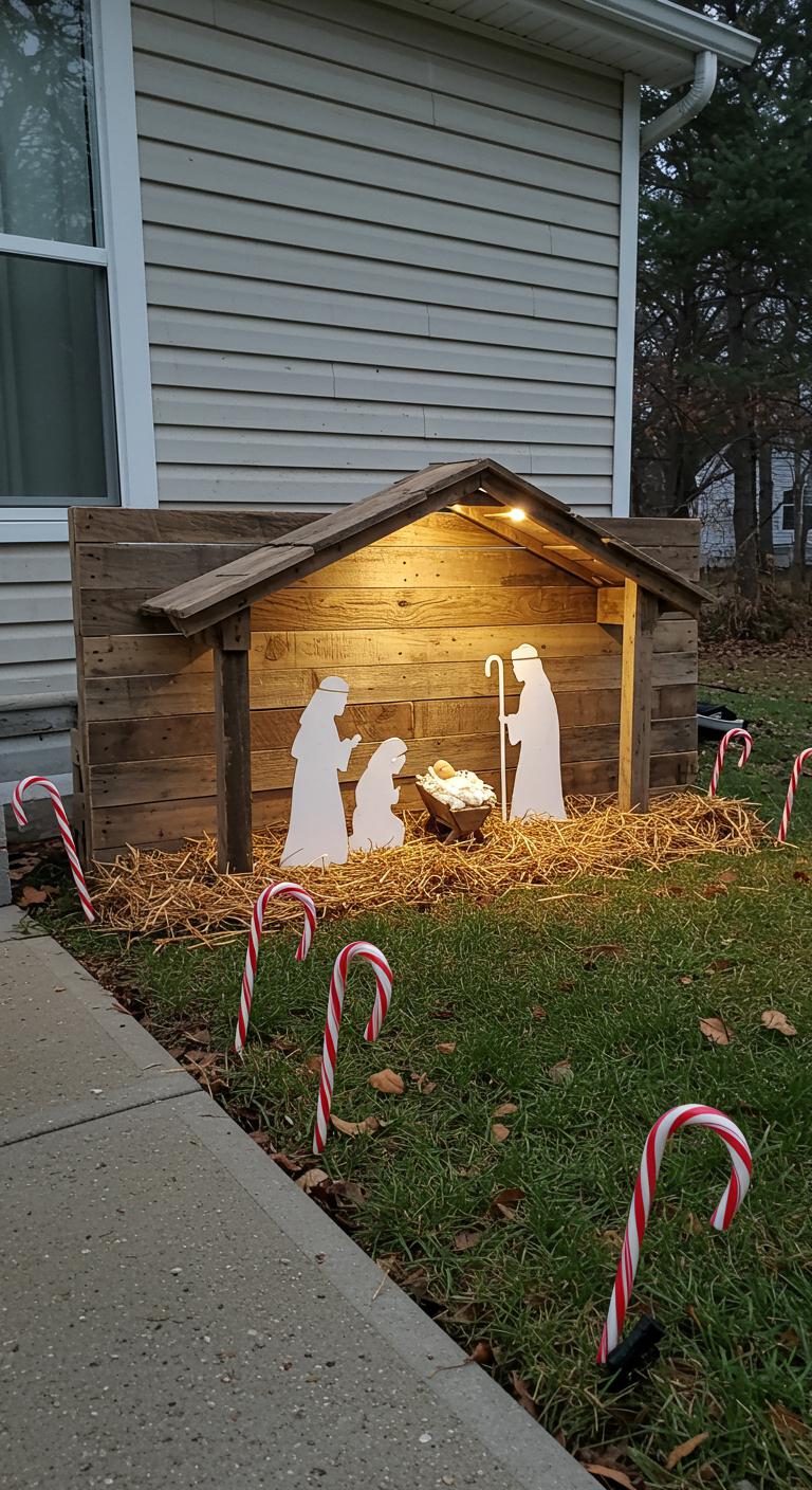 After you’ve planted candy canes along the lawn, bring a warm, rustic centerpiece to the yard with a pallet wood nativity scene you can build from reclaimed boards.